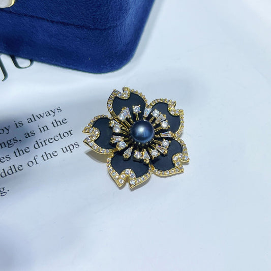 Enamel Black Tea Flower Natural Pearl Brooch
