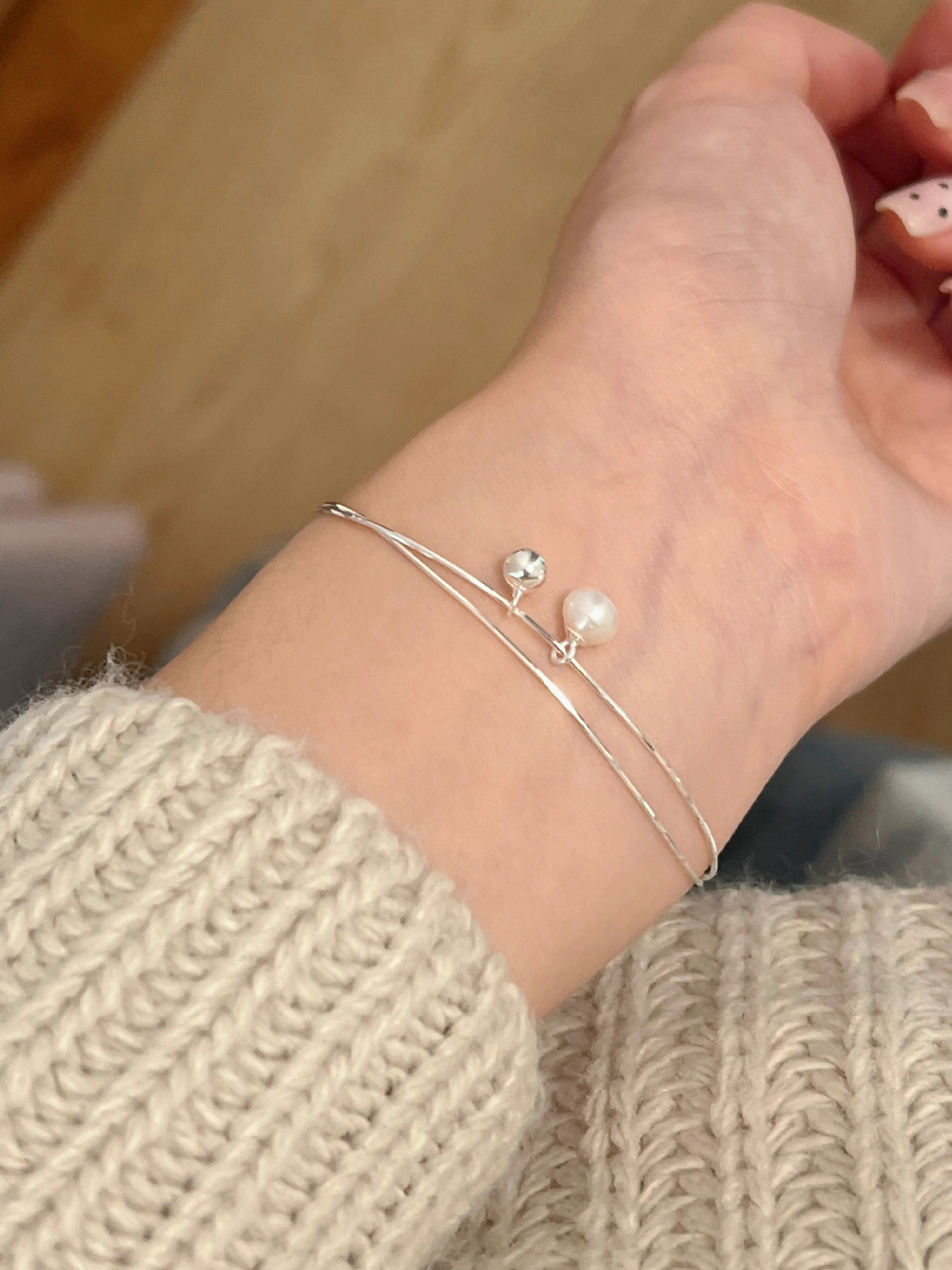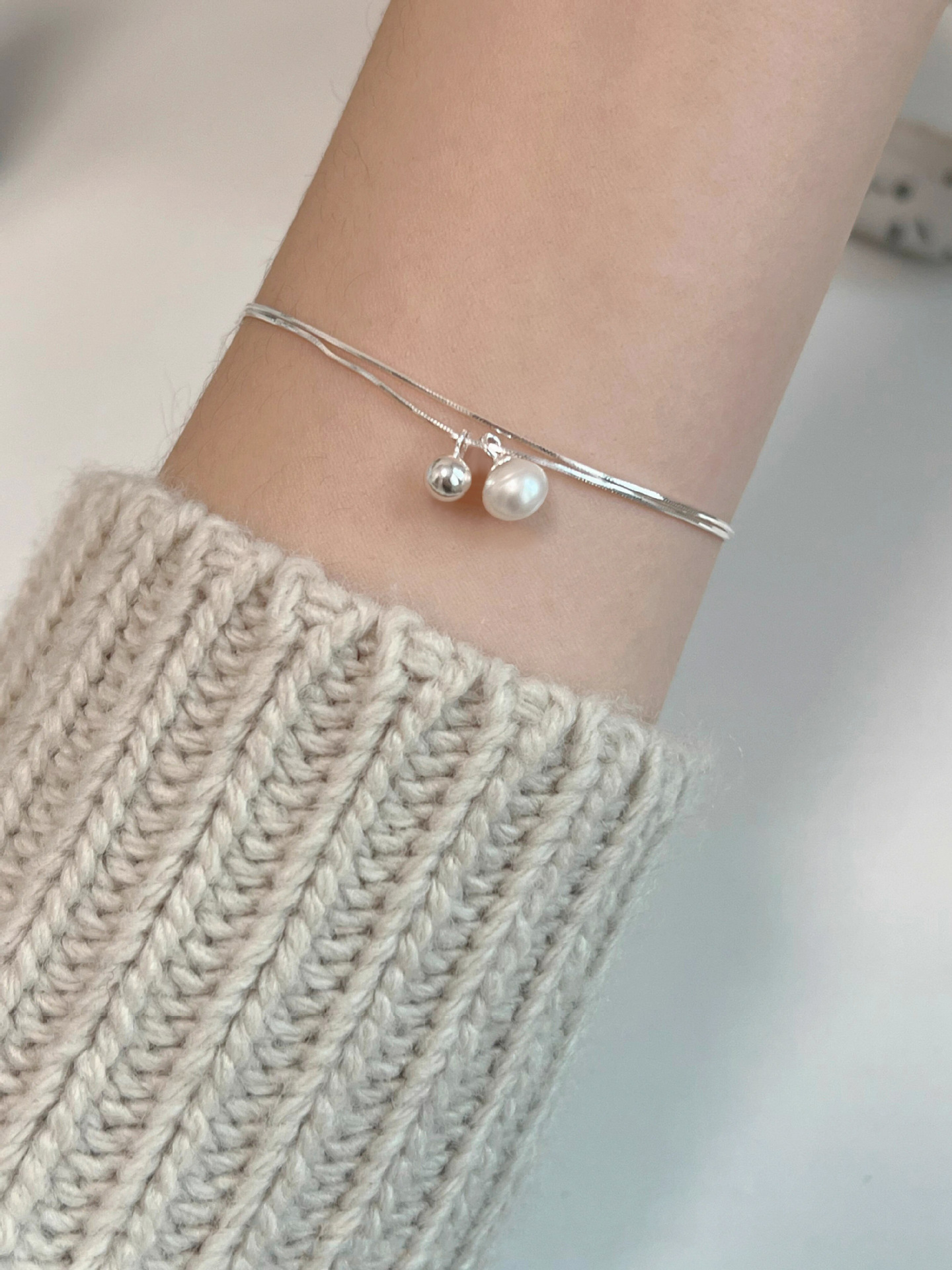 Natural Pearl Ball Double Layer Minimalist Design Silver Bracelet
